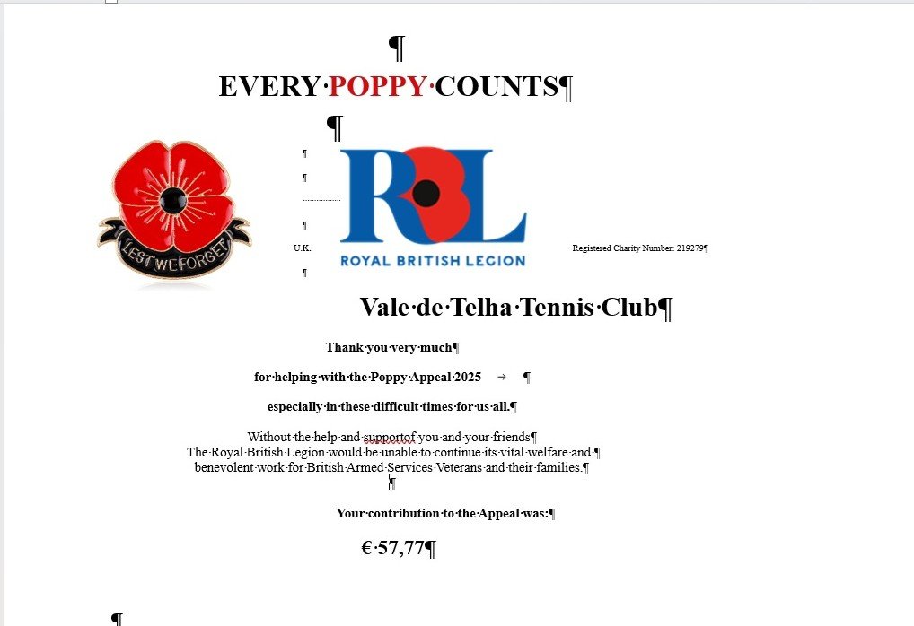 Also, please see the acknowledgement of the Vale da Telha Tennis Club by the Royal British Legion. Thanks to all who donated!