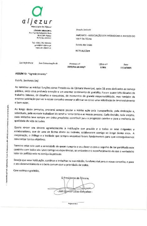 We have received a letter from the former Mayor of Aljezur (please see below), President José Manuel Lucas Gonçalves, and I wish to thank him for his support and assistance over the last four years