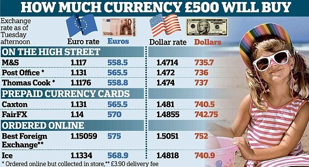 Fears over further plunges have led to a sales frenzy of currency cards, which travellers can load up with euros or dollars at that day’s rate. Specialist International Currency Exchange has seen orders for pre-paid euro cards soar by 547 per cent in the past month, while those for the U.S. dollar card are up an astonishing 1,050 per cent.