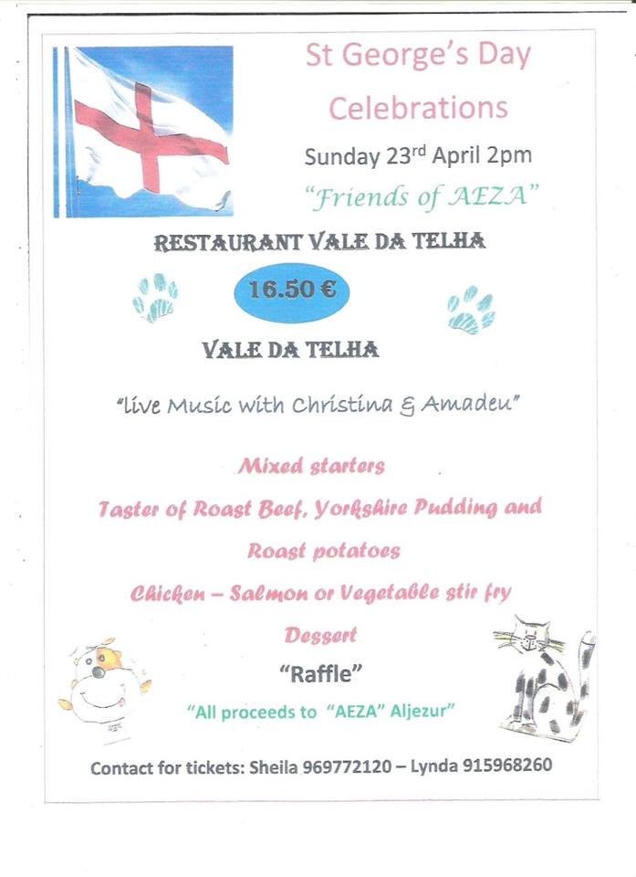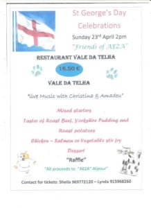 The Friends of AEZA team are organising a St George’s Day fundraiser at Jose’s Restaurante Vale Da Telha next Sunday, April 23rd, the date set aside each year to celebrate England’s patron saint.