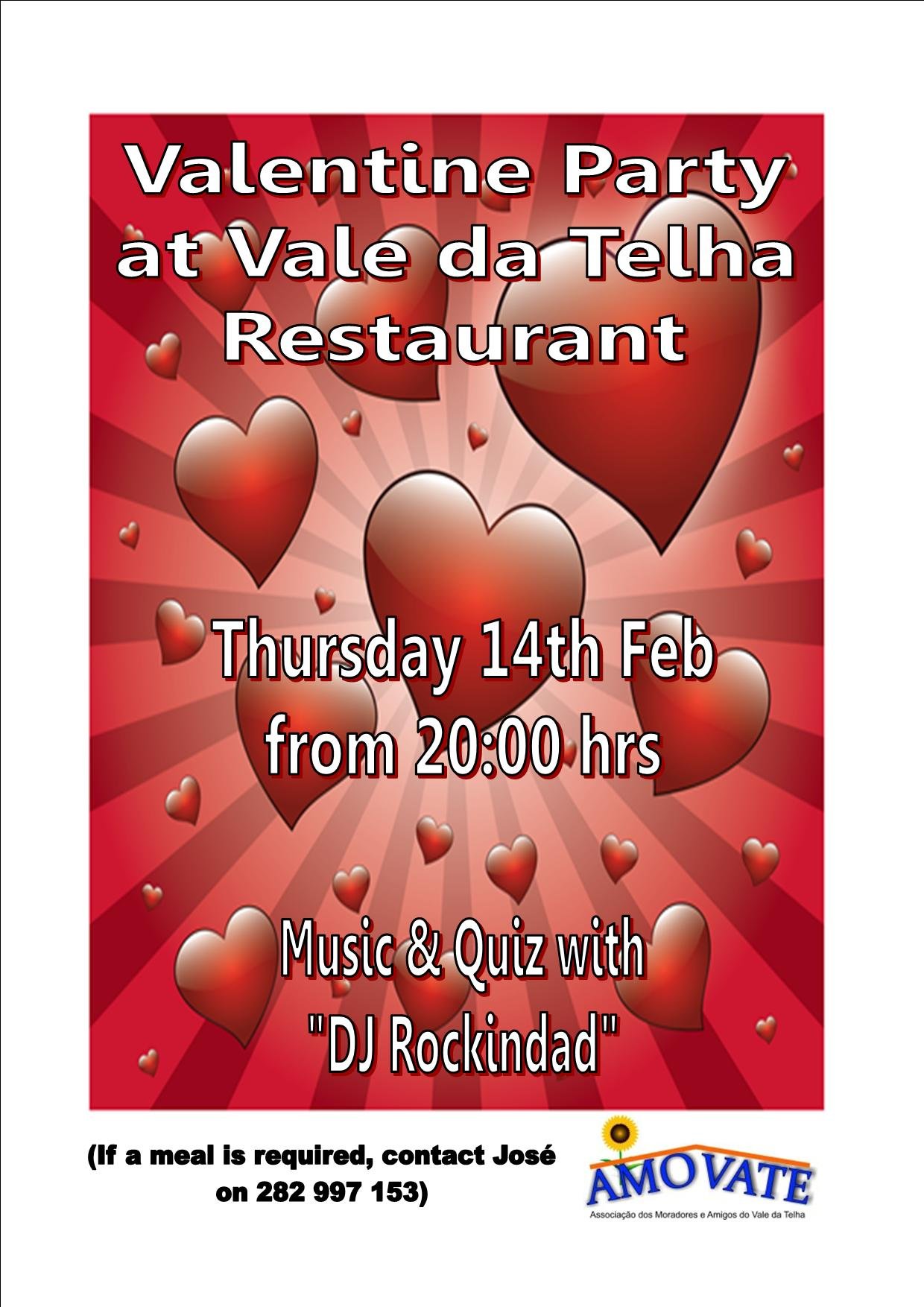 Thursday 14th February Valentine Party – will start at 8pm, there will be a  quiz, then dance the night away, to songs of passion and